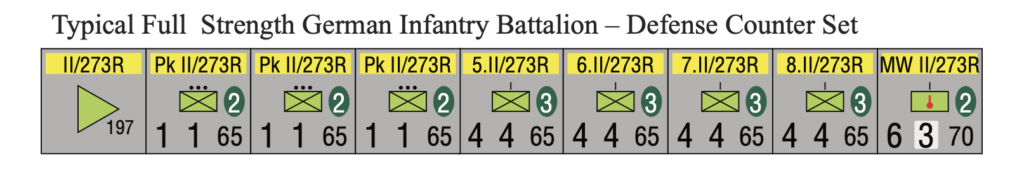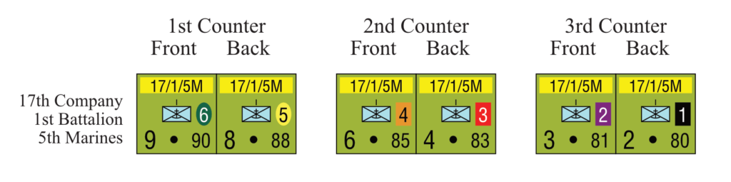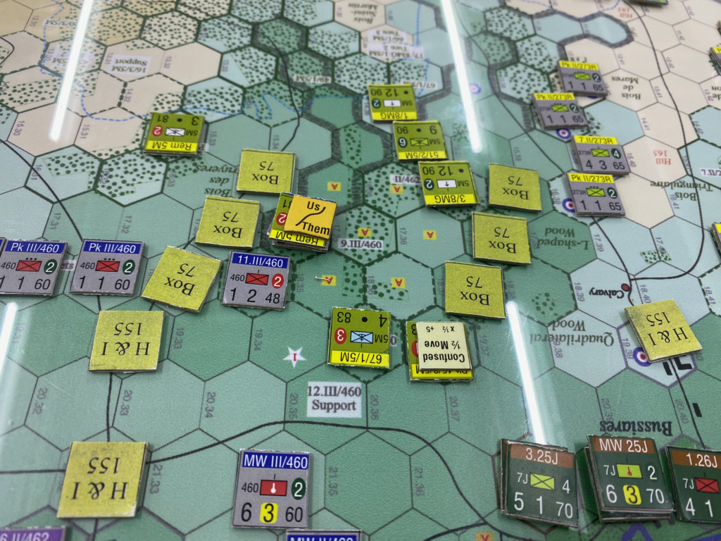 The game covers the key points of the month-long campaign, with a map covering the entirety of the relevant battlefield. It starts with the final German assault on June 3rd, continues with the main US attack on June 6th and the smaller actions on the following days, the July 1st assault on Vaux, plus a hypothetical German counterattack (which they did attempt but failed to adequately resource). The individual playing pieces are the historical companies and batteries, with the platoon pickets. These are organized into battalions, regiments, and brigades. The game operates at two levels – the small-scale tactical (moving, firing, hiding) and divisional command (ordering brigades and regiments, tracking their exhaustion, allocating artillery assets, and issuing new orders).